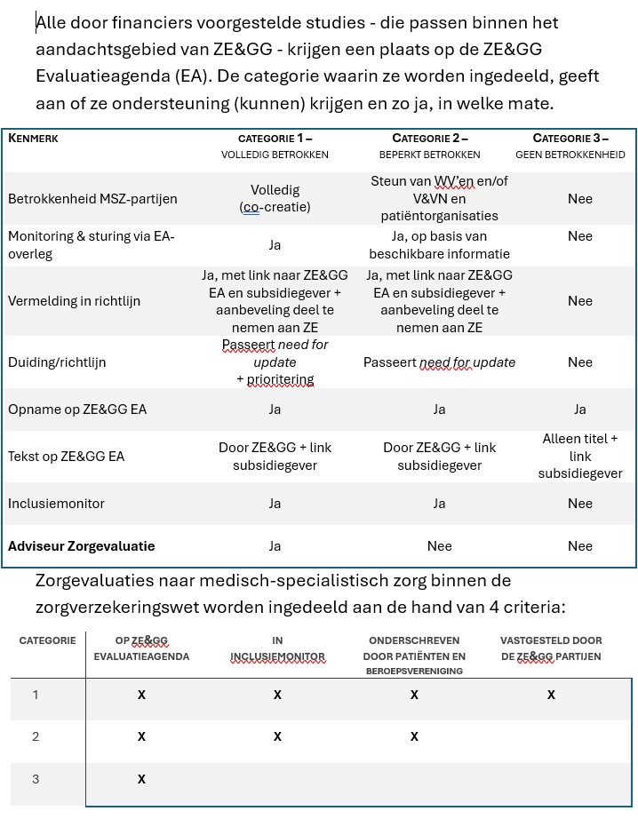 Voor het opschalen naar categorie 2 levert de projectleider een samenvatting aan van waar het project over gaat, de onderzoeksopzet, de voortgang, en eventuele andere informatie die relevant kan zijn om te beoordelen of het project binnen het aandachtsgebied van ZE&GG valt. Vervolgens zijn er verklaringen nodig van de relevante wetenschappelijke of beroepsvereniging(en) en patiëntenorganisatie(s). Na advies van de projectorganisatie beslissen de MSZ partijen binnen ZE&GG over opname op de Evaluatieagenda.